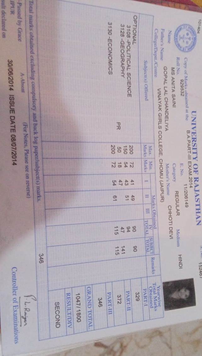 | 3 | B.A. | UNIVERSITY OF RAJASTHAN | 2014 | 58.16% |