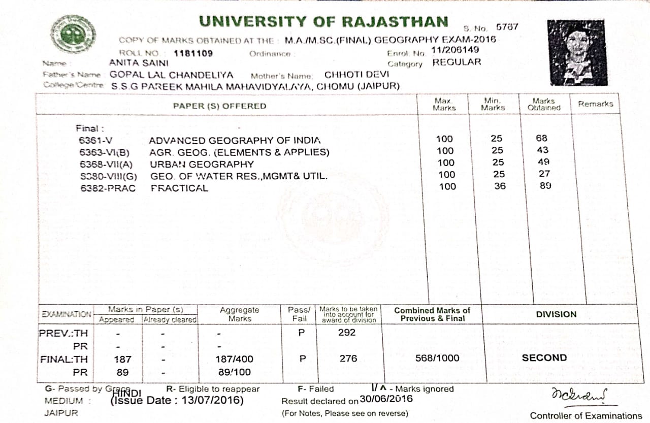 | 4 | M.A. | UNIVERSITY OF RAJASTHAN | 2016 | 56.80% |