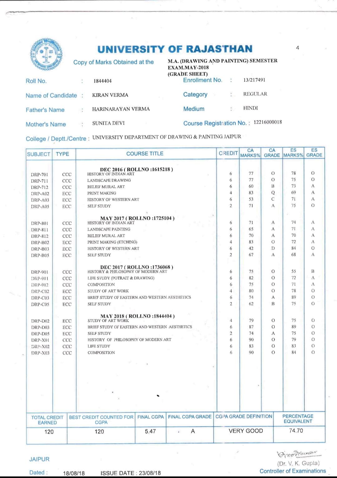 | 1 | B.A. | UOR JAIPUR | 2016 | 70.55% |