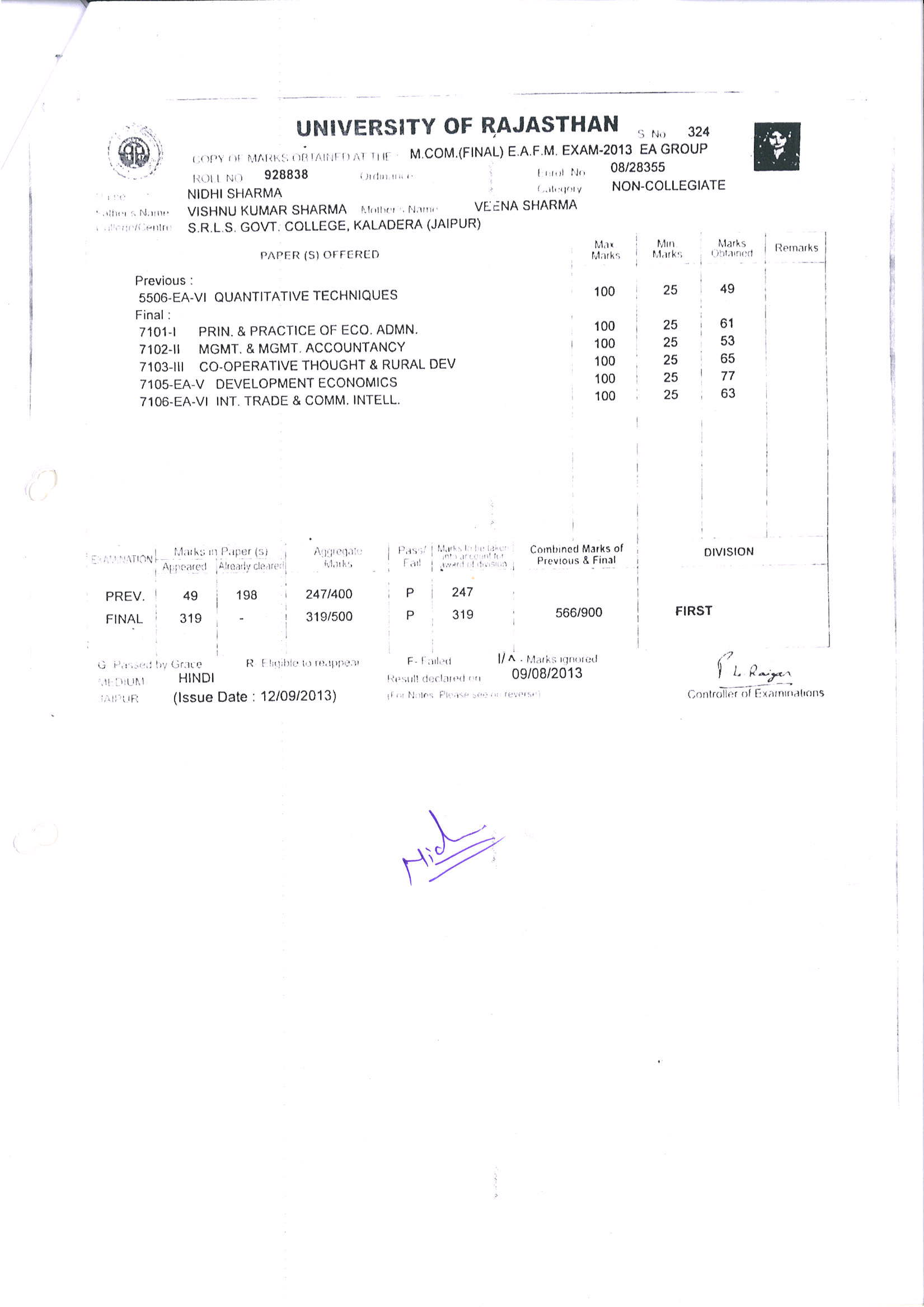 | 3 | M.COM. | UOR JAIPUR | 2013 | 62.88 |