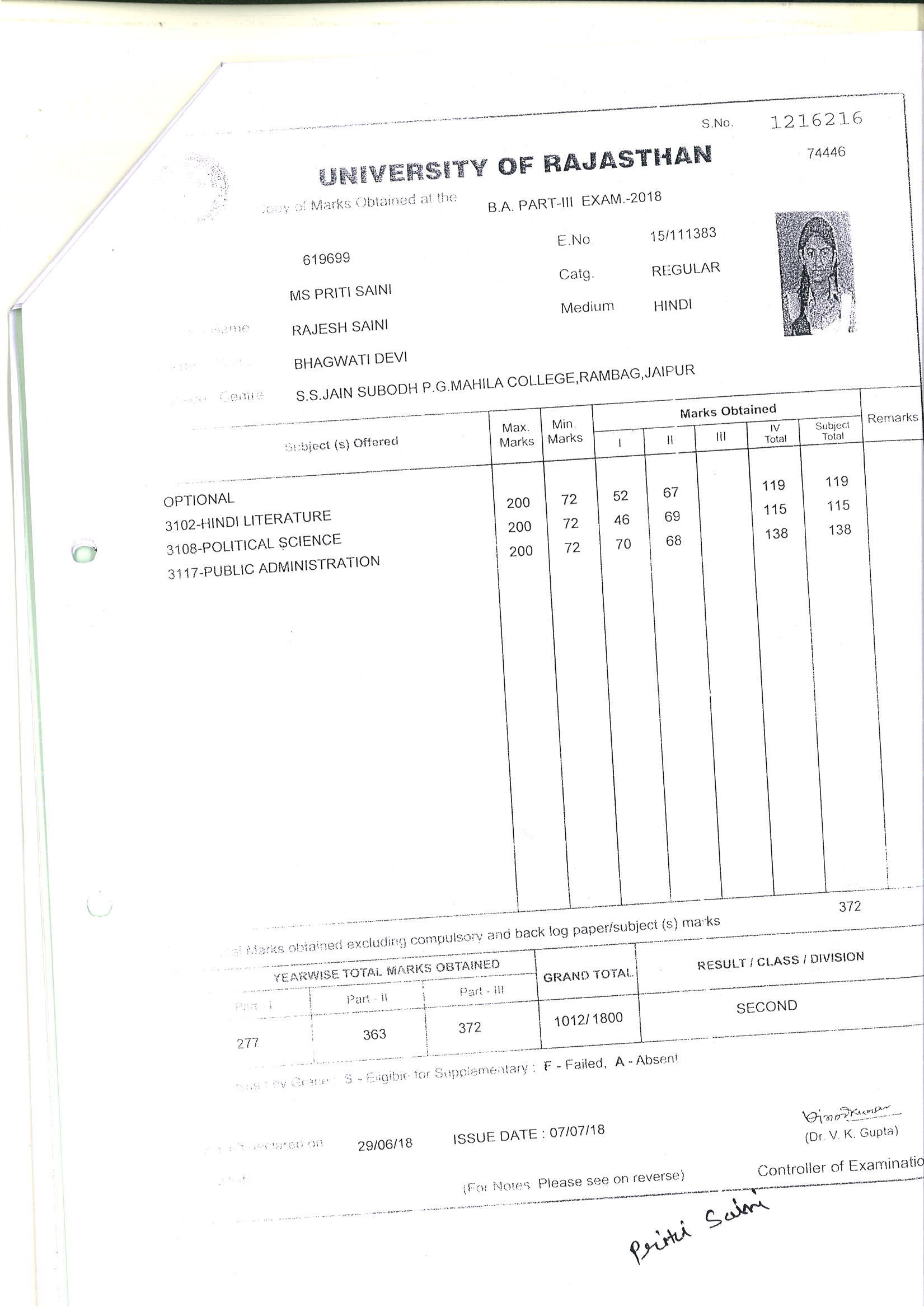 | 3 | B.A. | UOR, JAIPUR | 2018 | 56.22% |