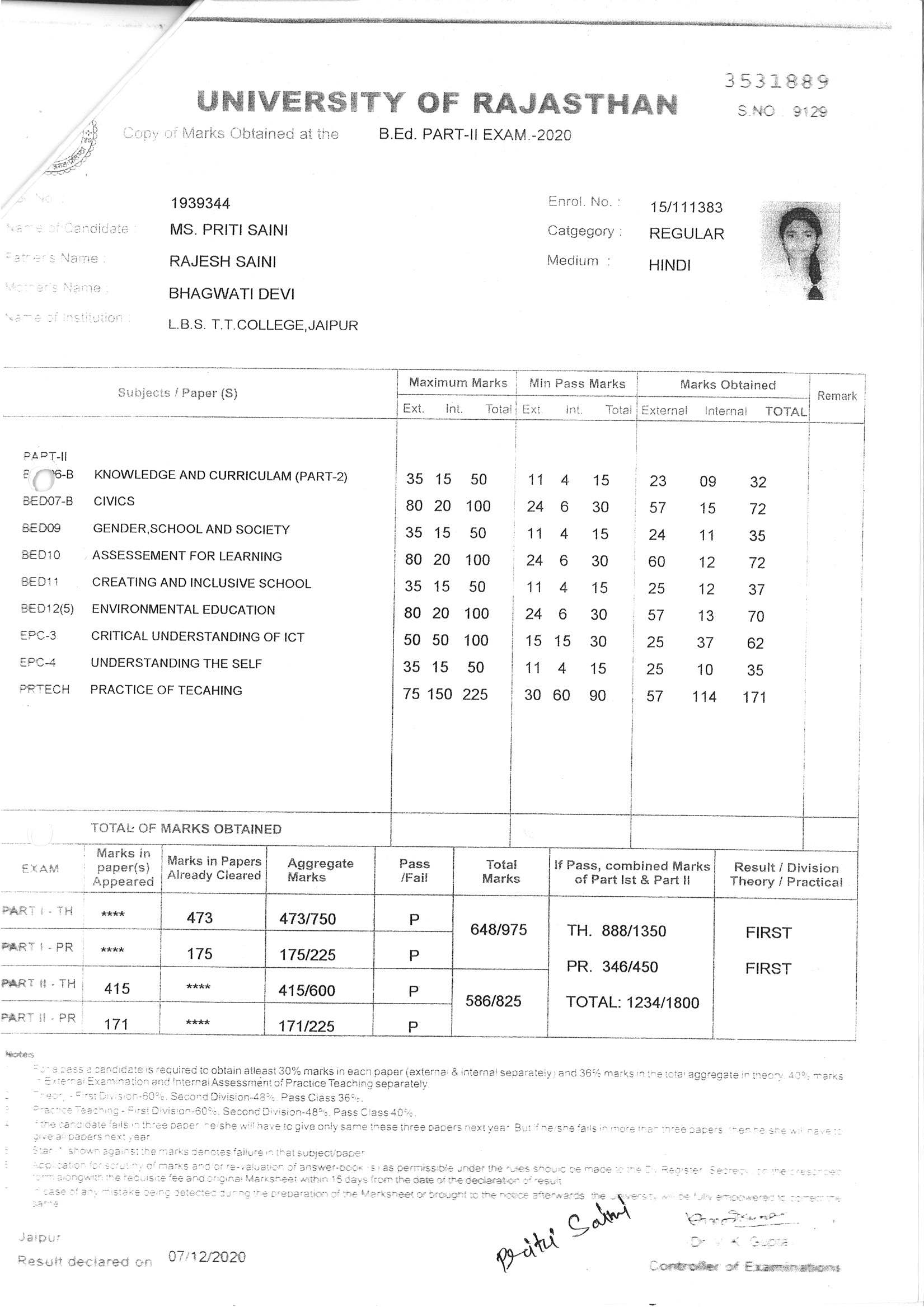 | 5 | B.Ed. | UOR,JAIPUR | 2020 | 68.55 % |
