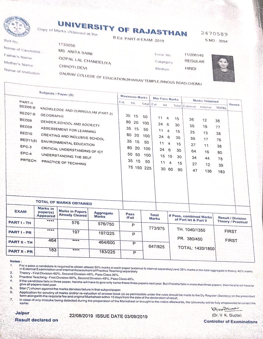 | 5 | B.ED. | UNIVERSITY OF RAJASTHAN | 2019 | 78.88% |
