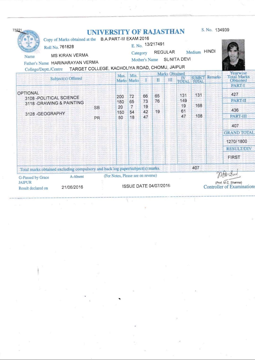 | 1 | B.A. | UOR JAIPUR | 2016 | 70.55% |