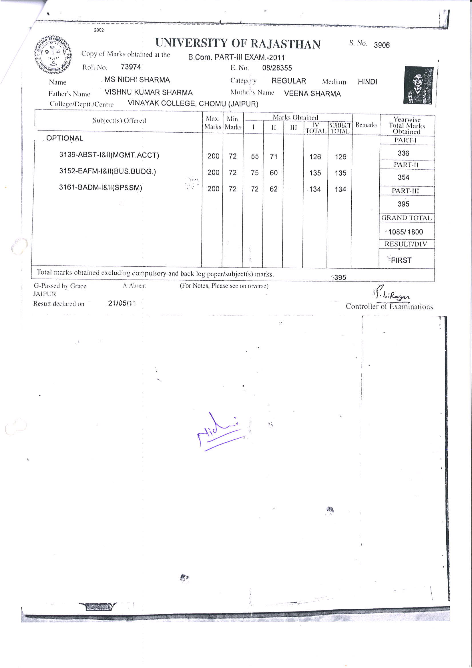 | 3 | M.COM. | UOR JAIPUR | 2013 | 62.88 |