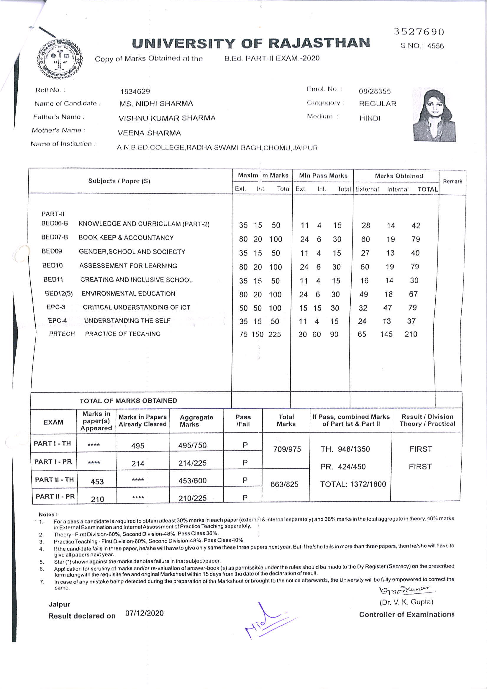 | 4 | B.ED. | UOR JAIPUR | 2020 | 76.22 |