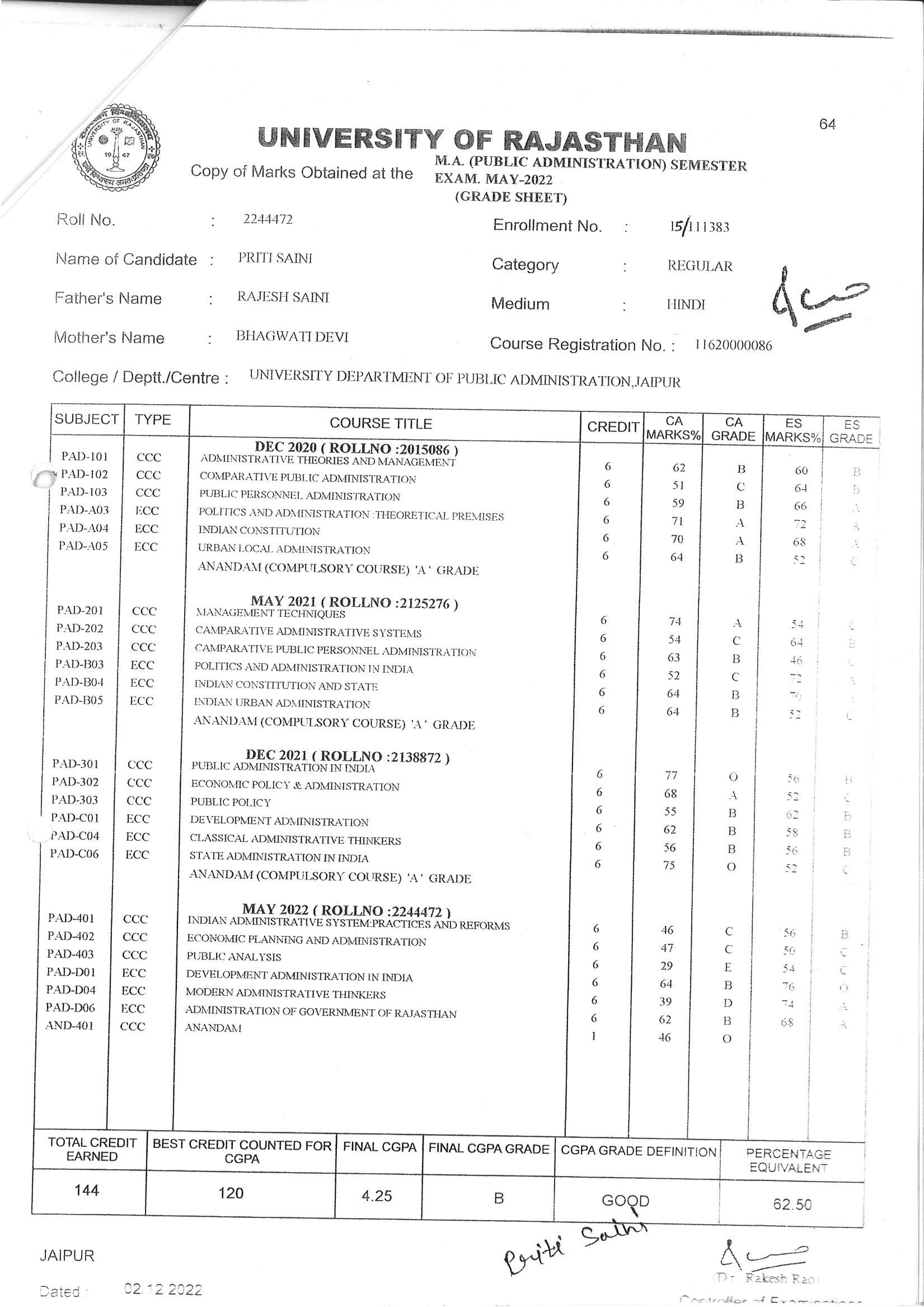 | 4 | M.A. | UOR, JAIPUR | 2022 | 62.50% |