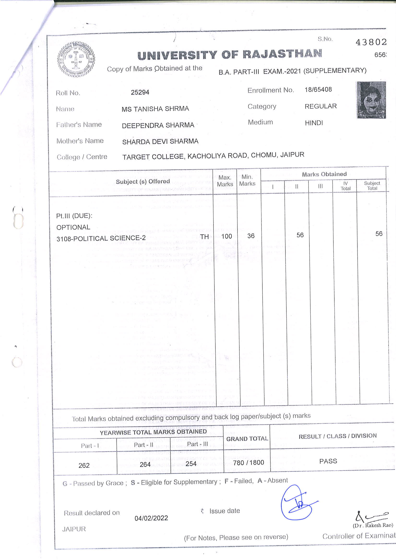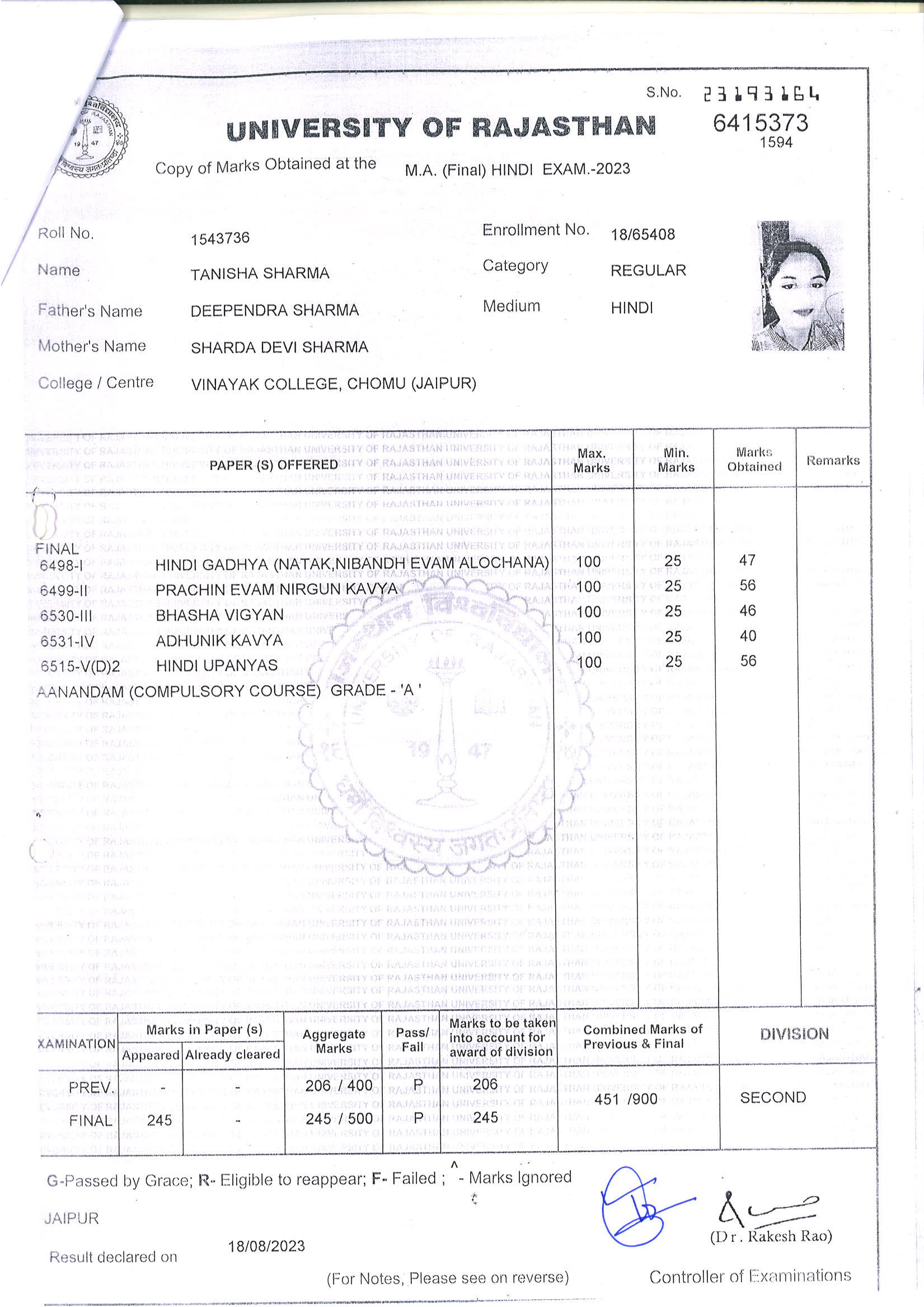 | 3 | M.A.(HINDI) | UOR, JAIPUR | 2023 | 50.00 |