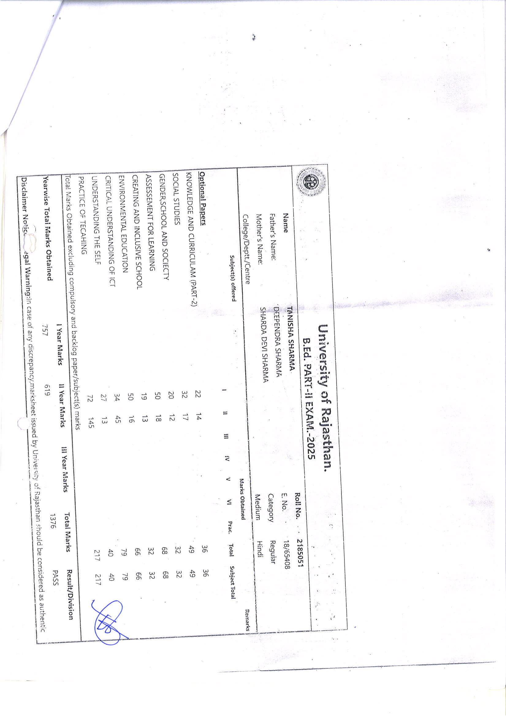 | 4 | B.ED. | UOR,JAIPUR | 2025 | 76.40 |